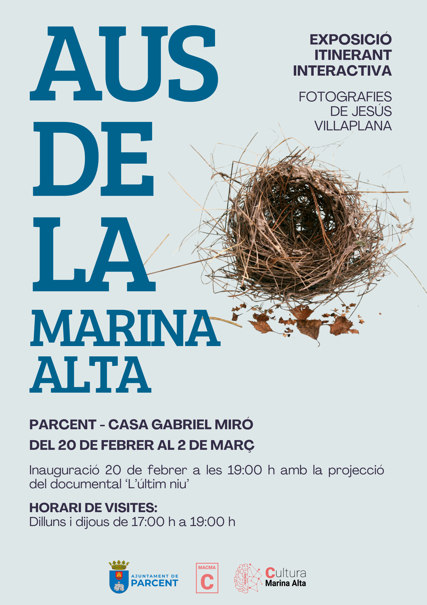 L'exposició itinerant “Aus de la Marina Alta” és una iniciativa des de l’àrea de cultura i patrimoni de la MACMA, Mancomunitat Comarcal de la Marina Alta, dissenyada per a apropar la riquesa ornitològica de la comarca a un públic ampli i divers, alhora que donem a conéixer els diferents ecosistemes existents a la comarca.